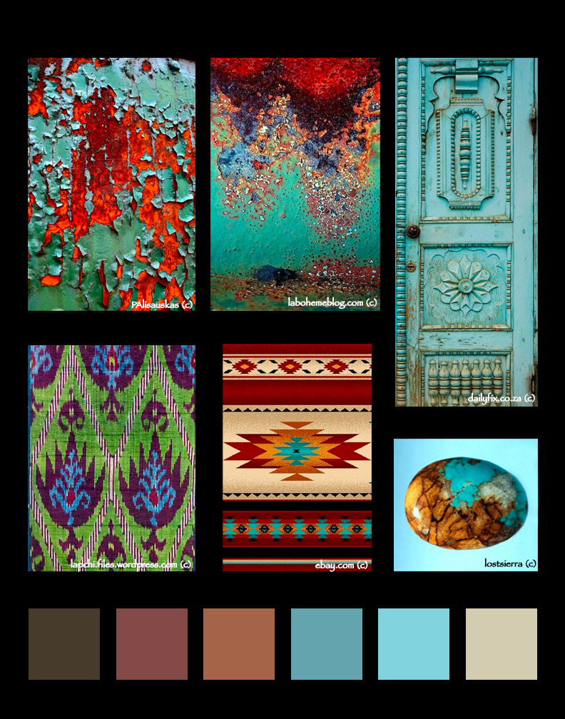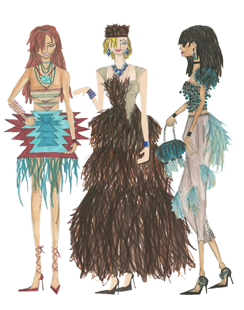 This mini collection was inspired by western fashion and Navajo prints and colors. I wanted to convey a rustic/distressed look and also incorporate a bit of glamour through jewels and furs.