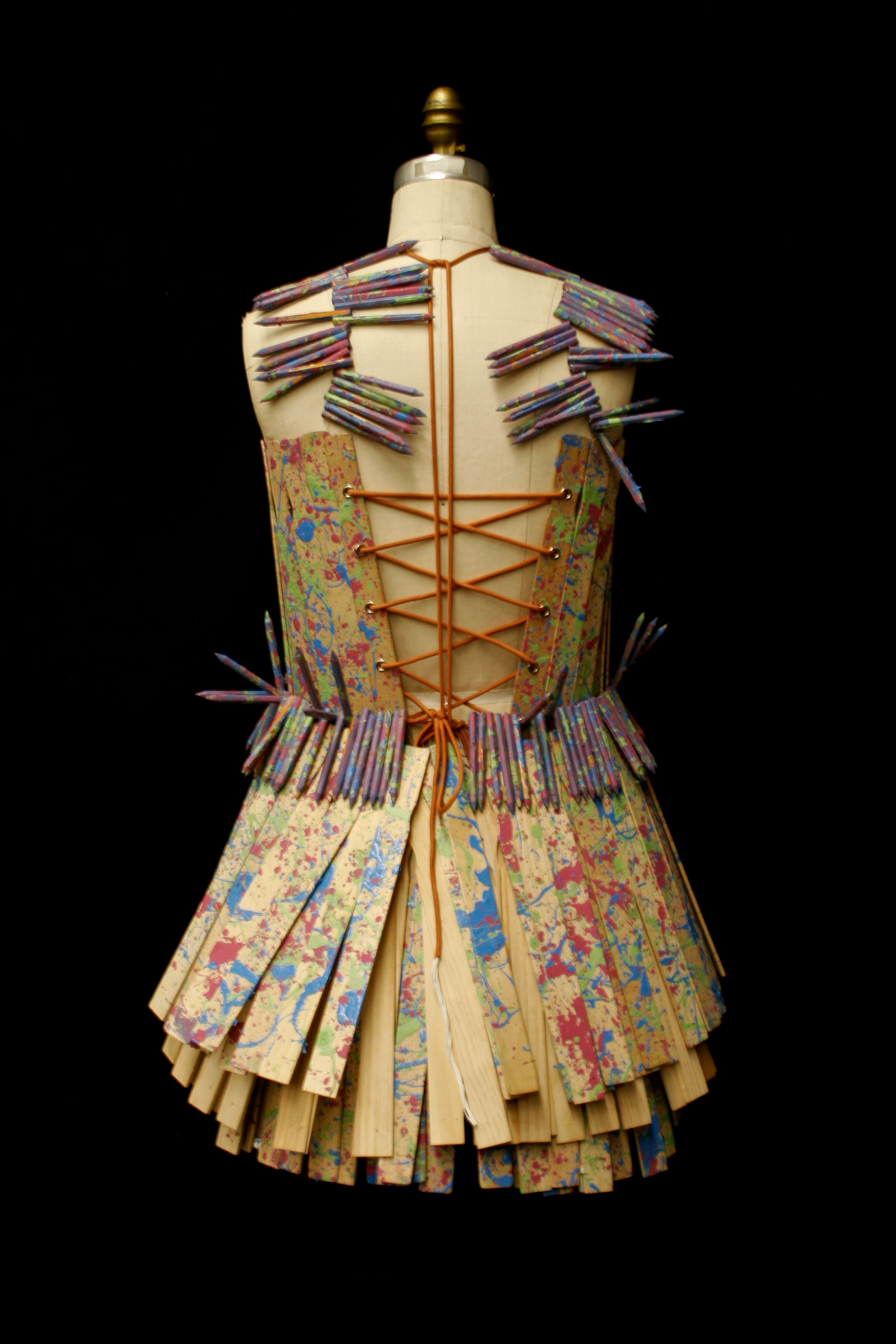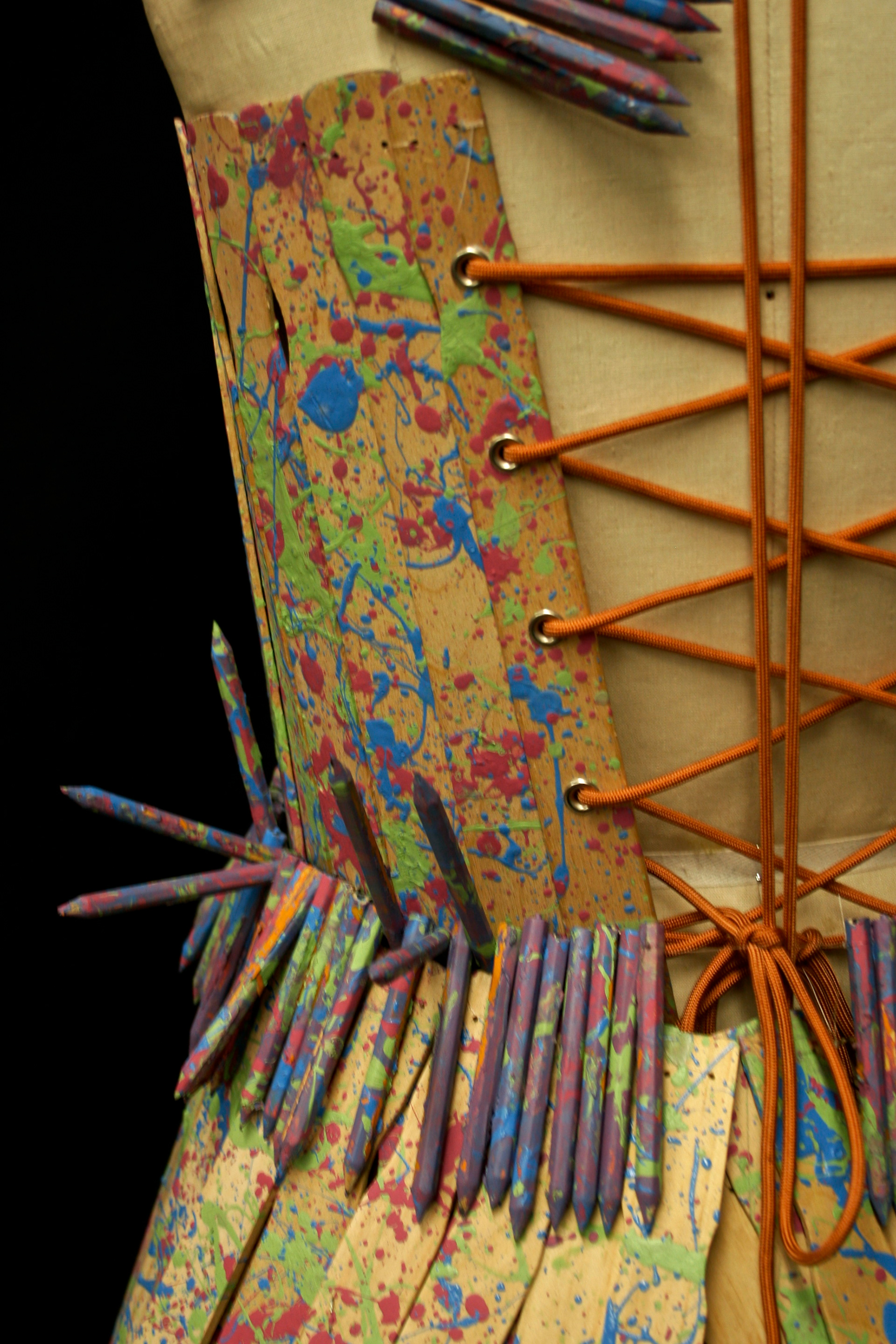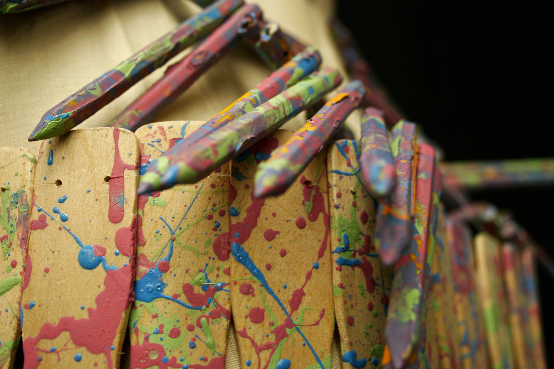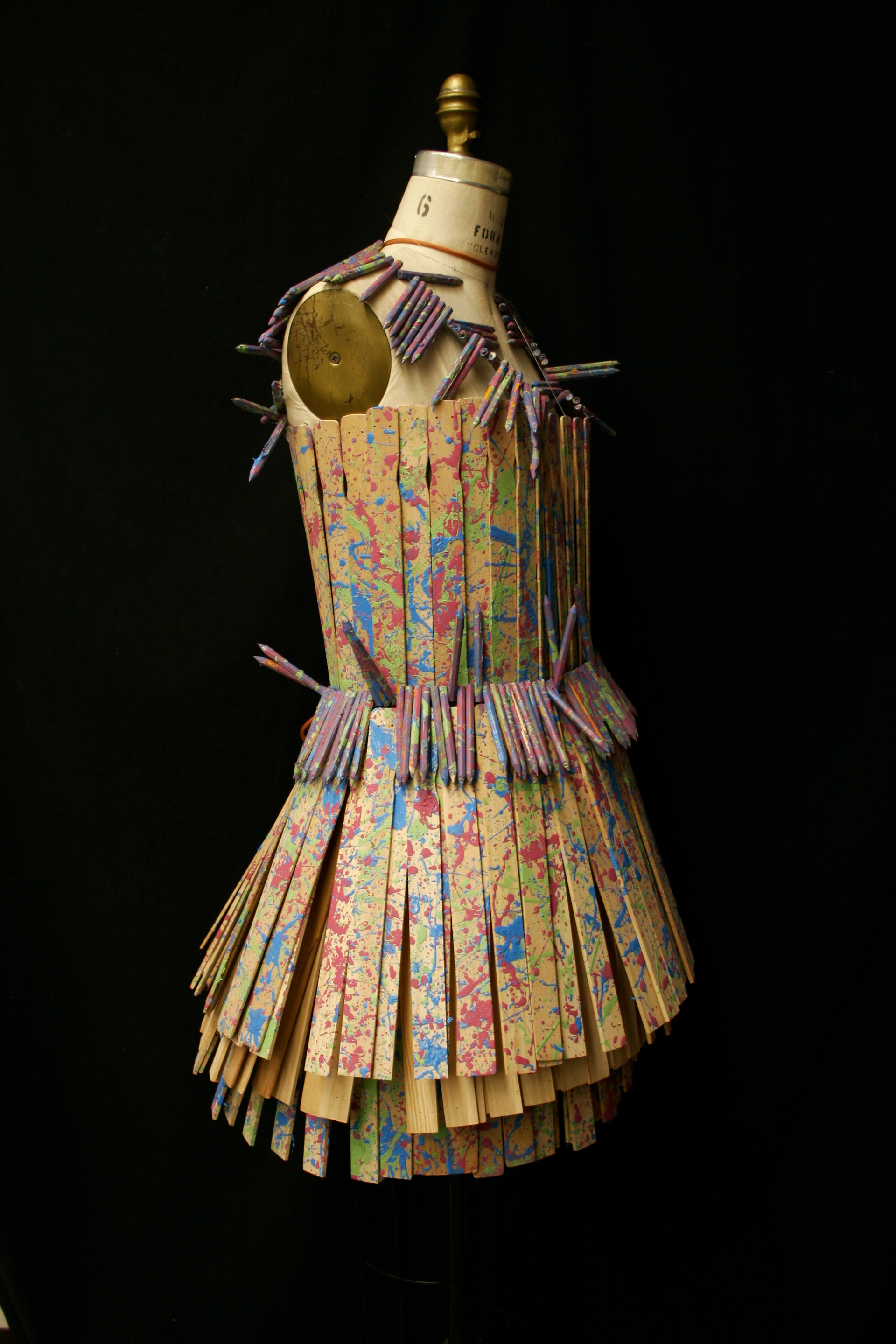 This piece was inspired by the creative process and how chaotic it can be. For this piece, I used only unconventional materials: paint sticks, golf pencils, paint, fishing line, and two shoe laces.